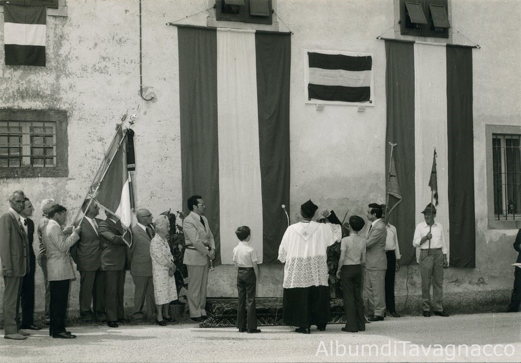 20° anniversario della morte del geologo Egidio Feruglio. Inaugurazione della lapide affissa sulla facciata di casa Feruglio. Il parroco, Don Nicolò Rossi, benedice la lapide in memoria di Egidio Feruglio alla presenza della vedova e di varie autorità.