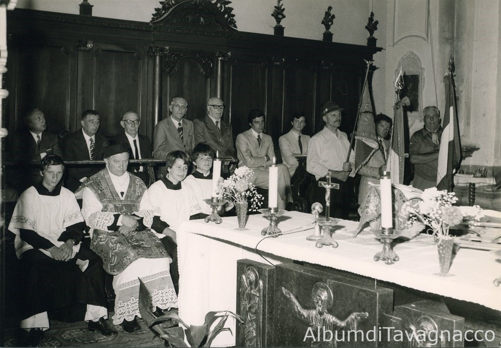 30° anniversario della liberazione. Il parroco di Feletto, Don Nicolò Rossi, alcune autorità comunali e i rappresentanti di associazioni partigiane, all’interno della chiesa di S. Antonio Abate durante la messa in memoria dei caduti.