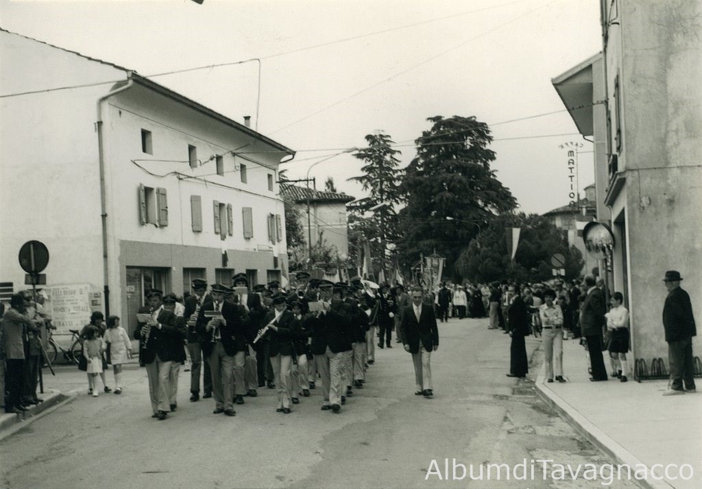 30° anniversario della liberazione. La banda musicale alla testa del corteo delle autorità e dei cittadini che, dopo la messa in memoria dei caduti, percorre Via dei Martiri.