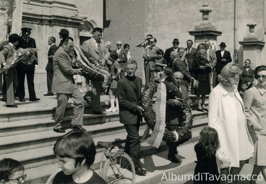 30° anniversario della lotta di liberazione. Reduci di guerra ed ex combattenti escono dalla chiesa di S. Antonio Abate trasportando due corone d’alloro da deporre sul vicino monumento ai caduti.