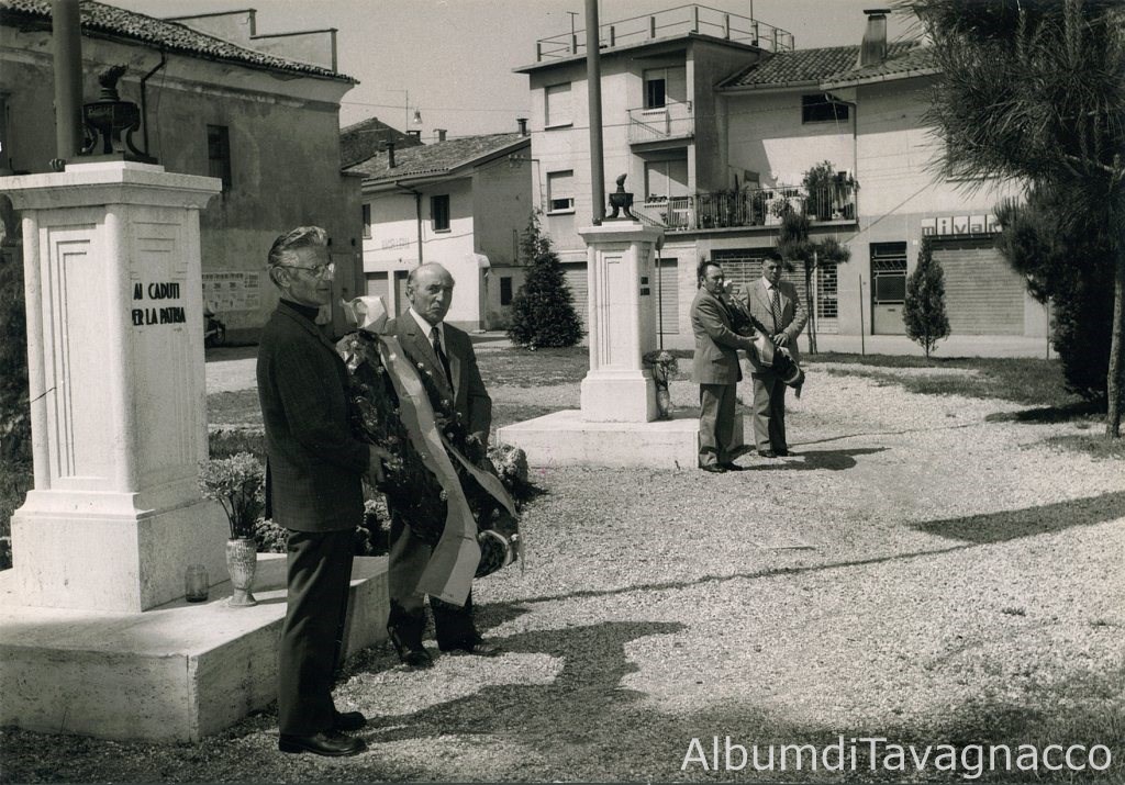 30° anniversario della lotta di liberazione. Reduci di guerra ed ex combattenti, davanti al monumento ai caduti, in Piazza Libertà, in posa prima di deporre le due corone d’alloro.