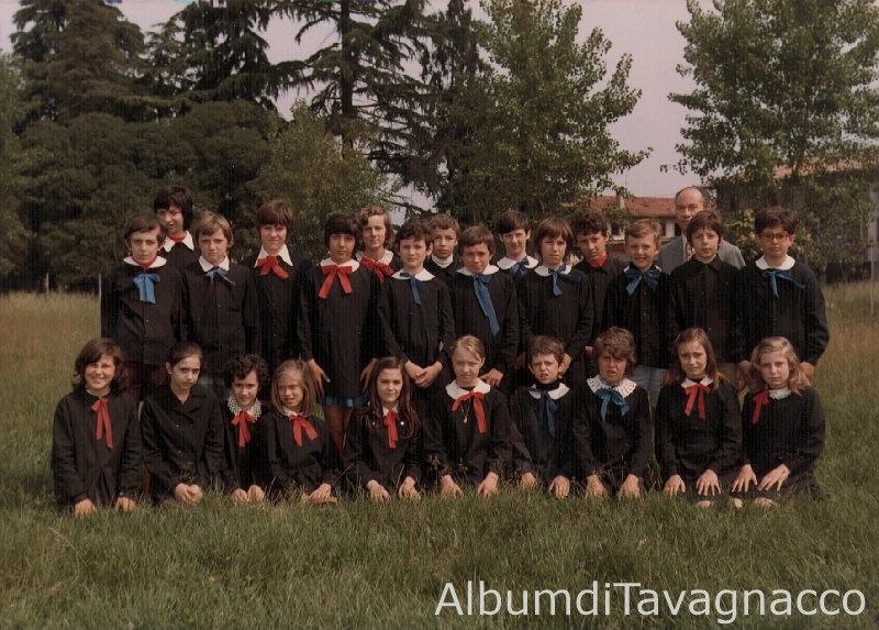 Gruppo di alunni della classe 5^ elementare, in posa insieme al maestro Ricciutti, nel parco di Feletto.