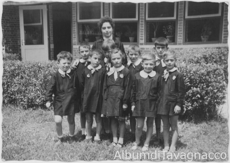 Gruppo di alunni in posa con la maestra nel cortile della scuola elementare.