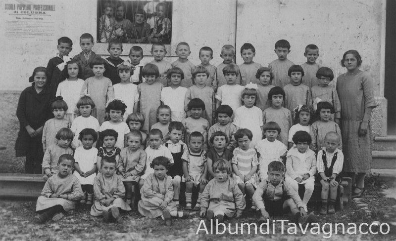 Gruppo di alunni di una classe elementare, in posa con la maestra, all'esterno della scuola di Colugna.