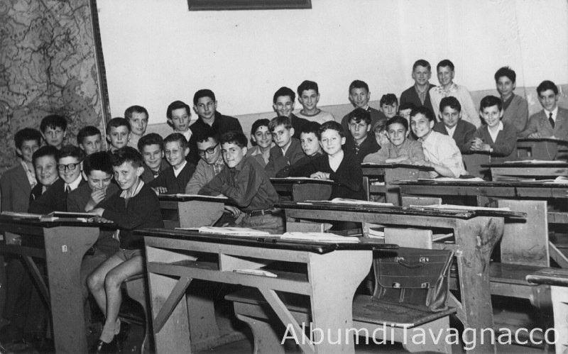 Gruppo di alunni di una classe elementare, in posa e seduti sui banchi, all'interno dell'aula.