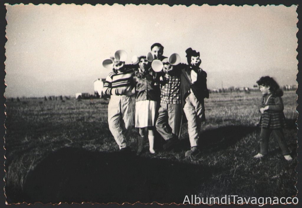Gruppo di amici in maschere disneyane, in posa sul prato.