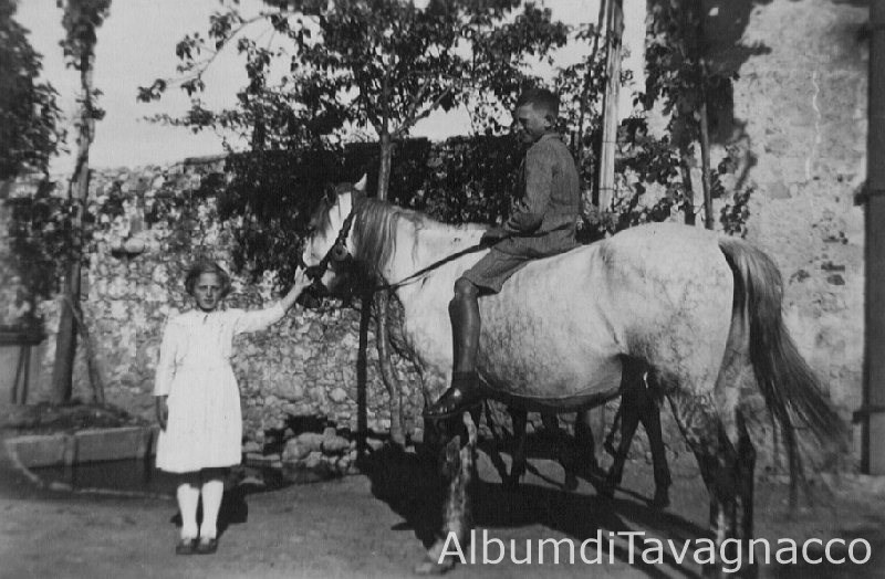 Ritratto di Arduino Todon, in sella a un cavallo, e di Lerda Tonutti, entrambi in posa nel cortile.