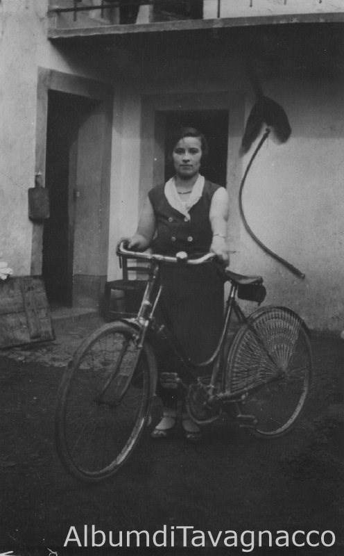 Ritratto di Assunta Macorigh, in posa con la bicicletta, nel cortile.