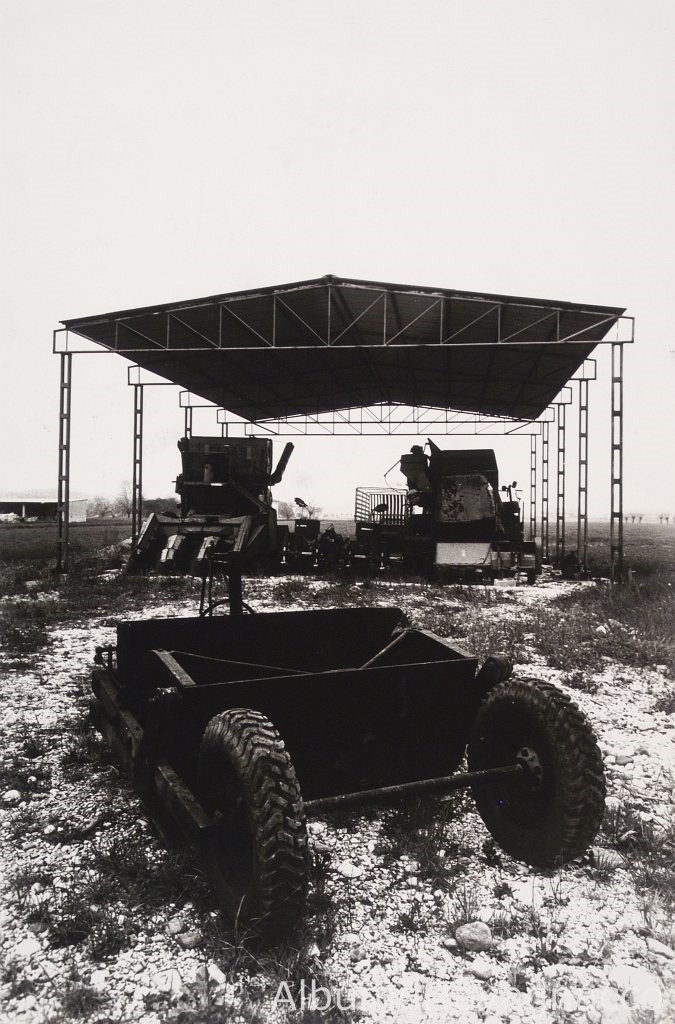 Macchine e attrezzature agricole a ricovero sotto una tettoia di una azienda locale.