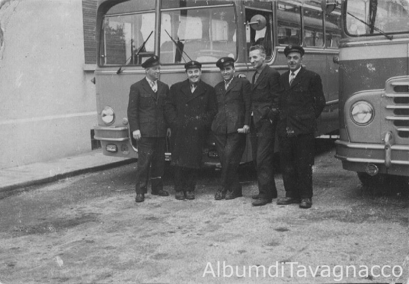 Gruppo di autisti in posa davanti a due autobus.