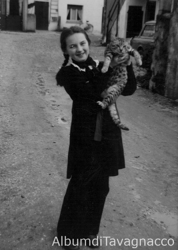 Ritratto di una bambina di nome Rosella che mostra un gatto tenendolo in alto con entrambe le mani.
