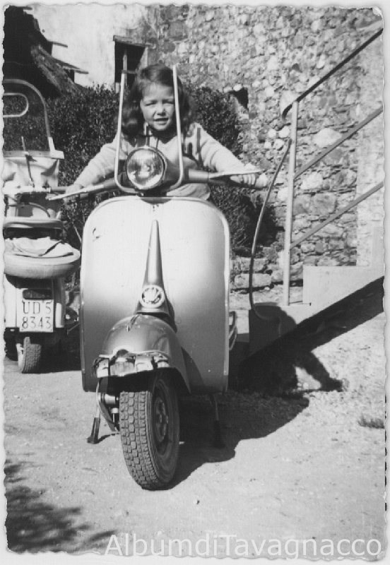 Ritratto di una bambina in posa sulla vespa e all'interno di un cortile.