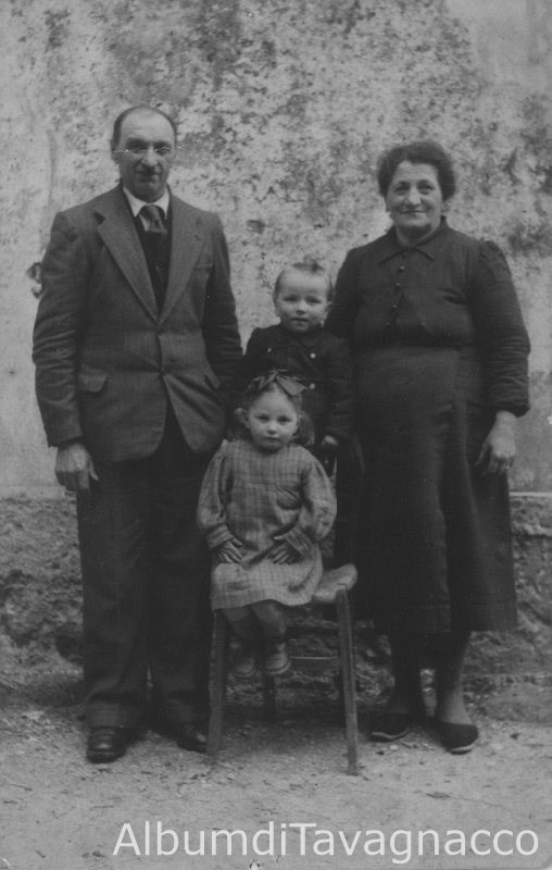 La bambina Loretta Petri seduta su una sedia insieme al cugino e a fianco del nonno e della nonna.