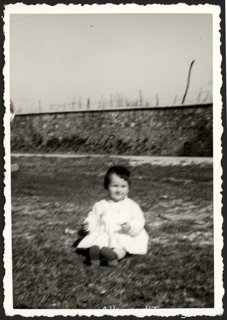 Ritratto della bambina Gabriella Noacco, all'età apparente di 2 anni ca., in posa e seduta su un prato.