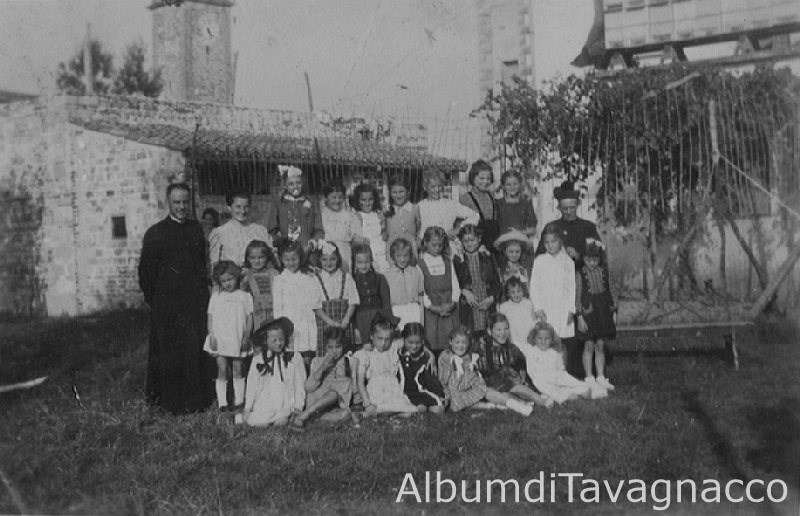 Gruppo di bambine, in posa insieme a due sacerdoti, nel cortile del "muini" (Via Della Chiesa).