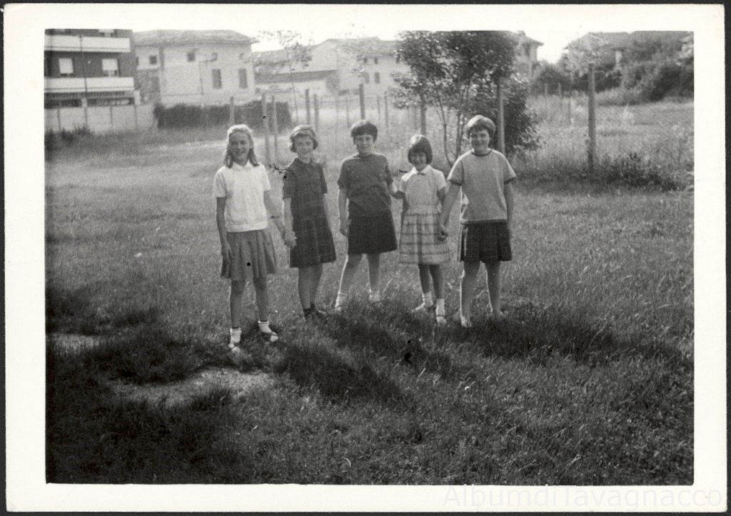 Gruppo di bambine partecipanti alla "scuola di lavoro", in posa nel cortile di Villa Tinin, durante la ricreazione. Da sinistra: Sonia Virgilio, Cristina Asquini, Donatella Gobessi, Marcella Cristofoli e Adelidia Florit.