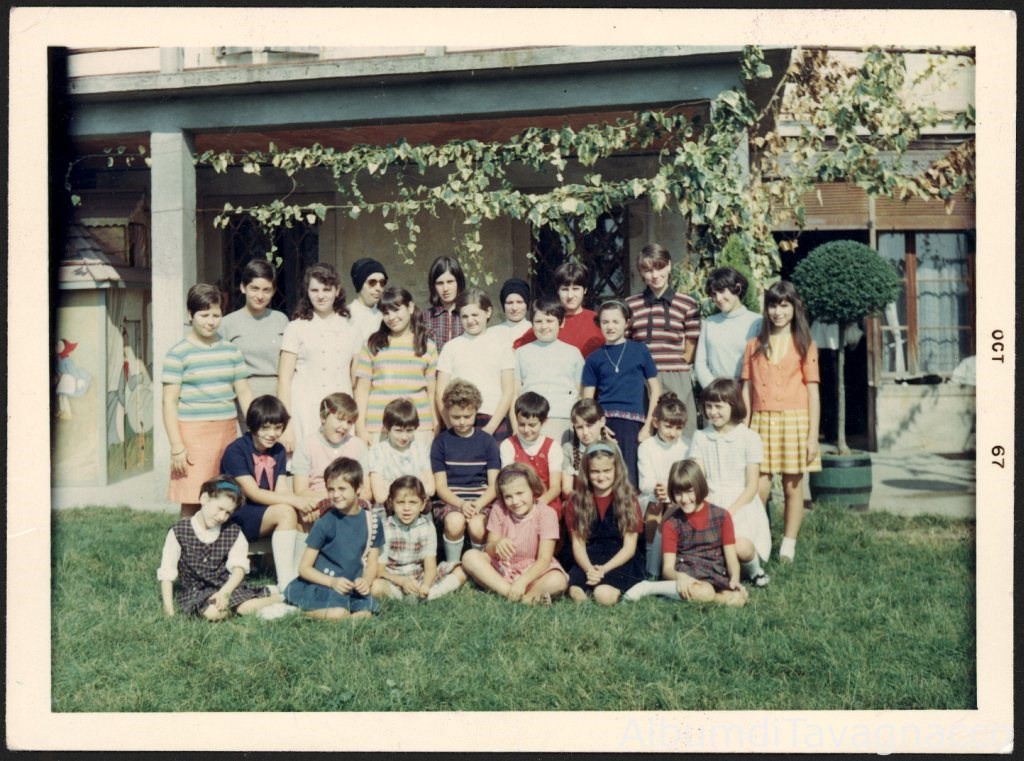Gruppo di bambine della "scuola di lavoro", in posa nel cortile di Villa Tinin, durante la ricreazione.