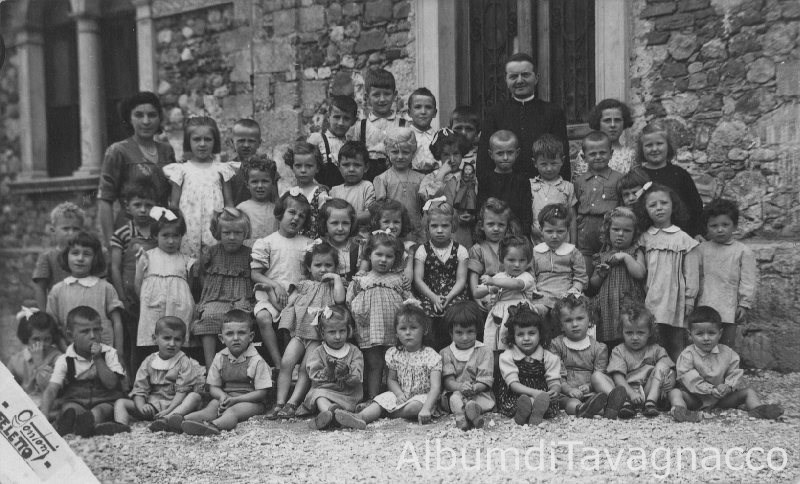 Gruppo di bambine di una classe dell'asilo, in posa con la maestra e il parroco, Padre Paolino.