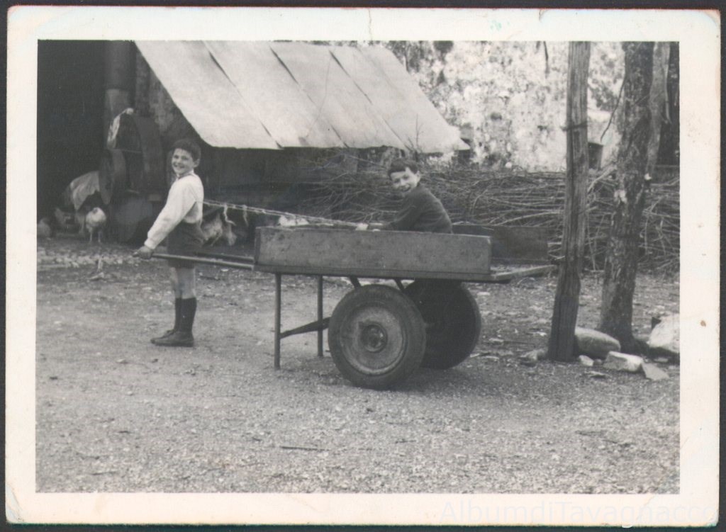 I bambini Paolo Pellarin e Ermes Tegon mentre giocano con un carretto nel cortile di casa Pellarin, in Via Canova 1.