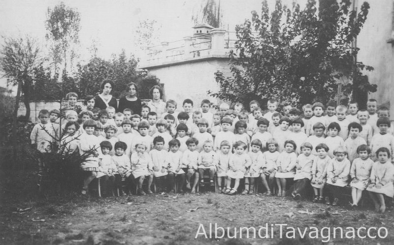 Gruppo di bambini dell'asilo, in posa in un giardino, insieme a tre maestre.