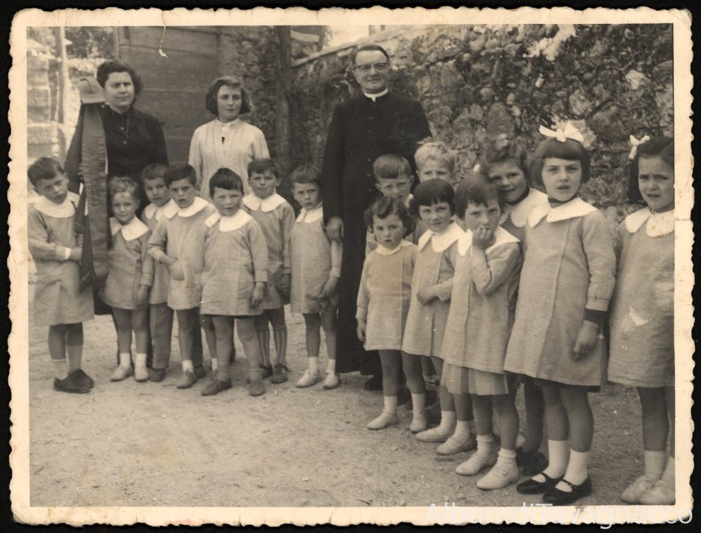 Bambini (nati tra il 1951 e il 1953) in posa, nel cortile dell'asilo, insieme alla maestra, Lucilla Canciani, e al parroco, Don Monsutti.