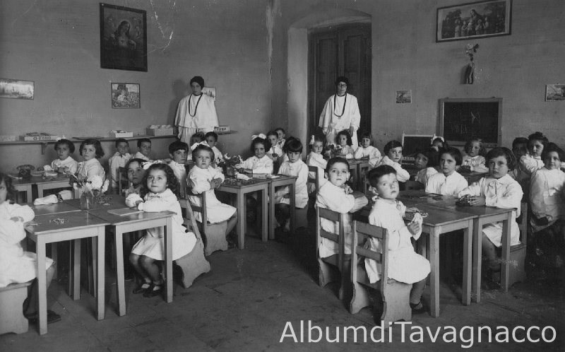 Gruppo di bambini di una classe dell'asilo, seduti attorno ai tavolini e all'interno di un'aula, in posa insieme a Suor Colomba e ad un'altra suora.