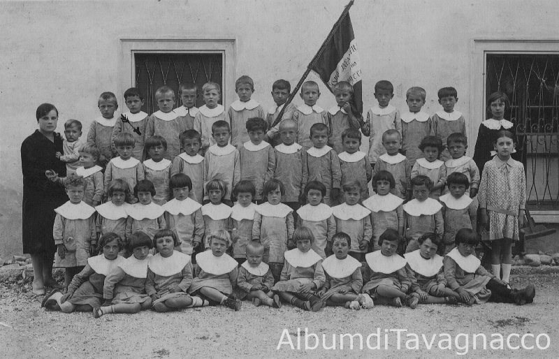 Gruppo di bambini dell'asilo di Cavalicco (residenti Cavalicco e Adegliacco), in posa insieme alla maestra.