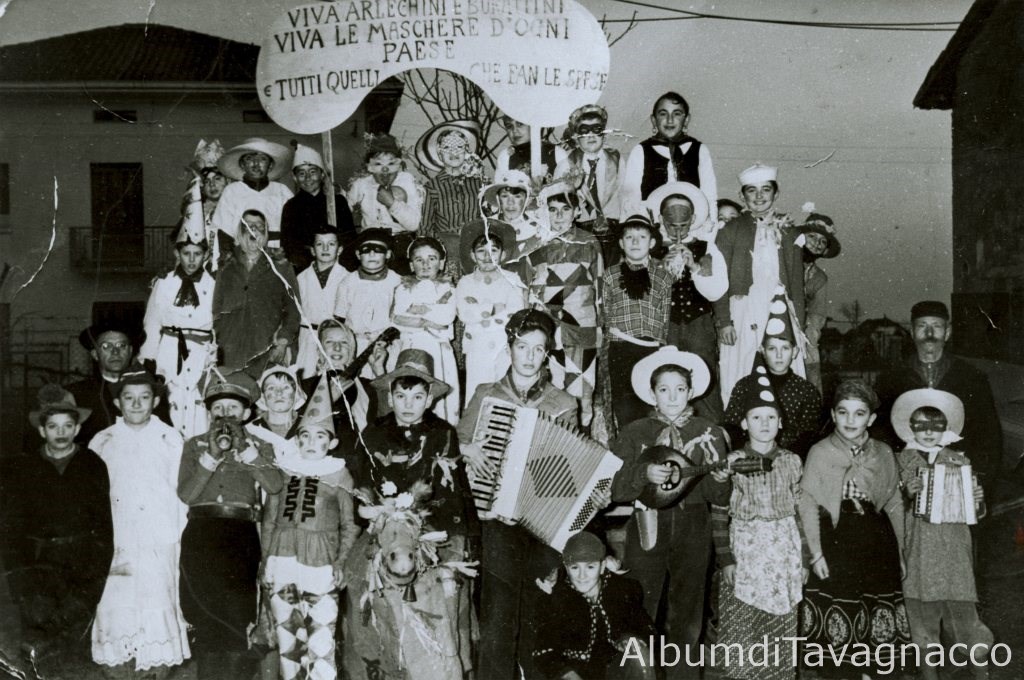 Gruppo di bambini in costume e con alcuni strumenti musicali, in posa insieme a un sacerdote, durante la mascherata di carnevale.