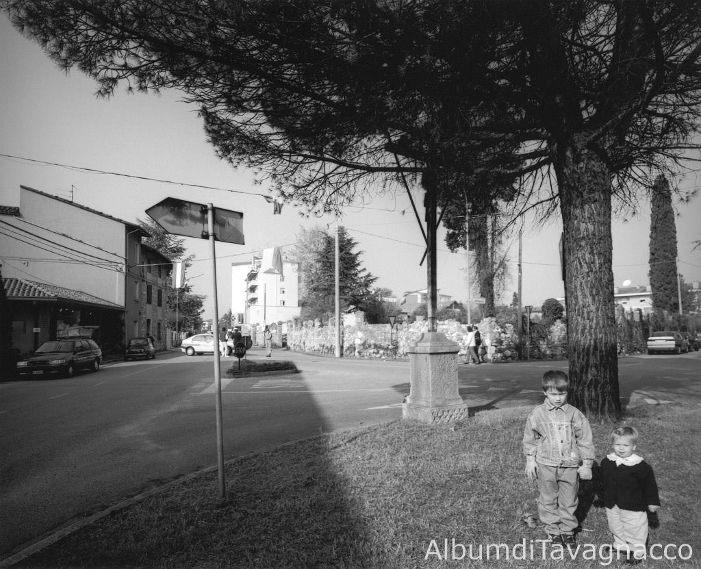 Bambino. - Bambina. - Aiuola. - Alberi. - Viale IV Novembre. - Via P. Micca. - Cartello stradale. - Muretto. - Case. - Palazzina. - Crocefisso