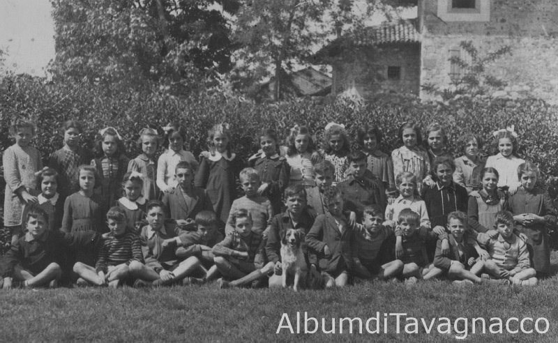Gruppo di bambini, in posa insieme a "Plotti" (cane meticcio, al centro) e sul prato antistante la scuola elementare.