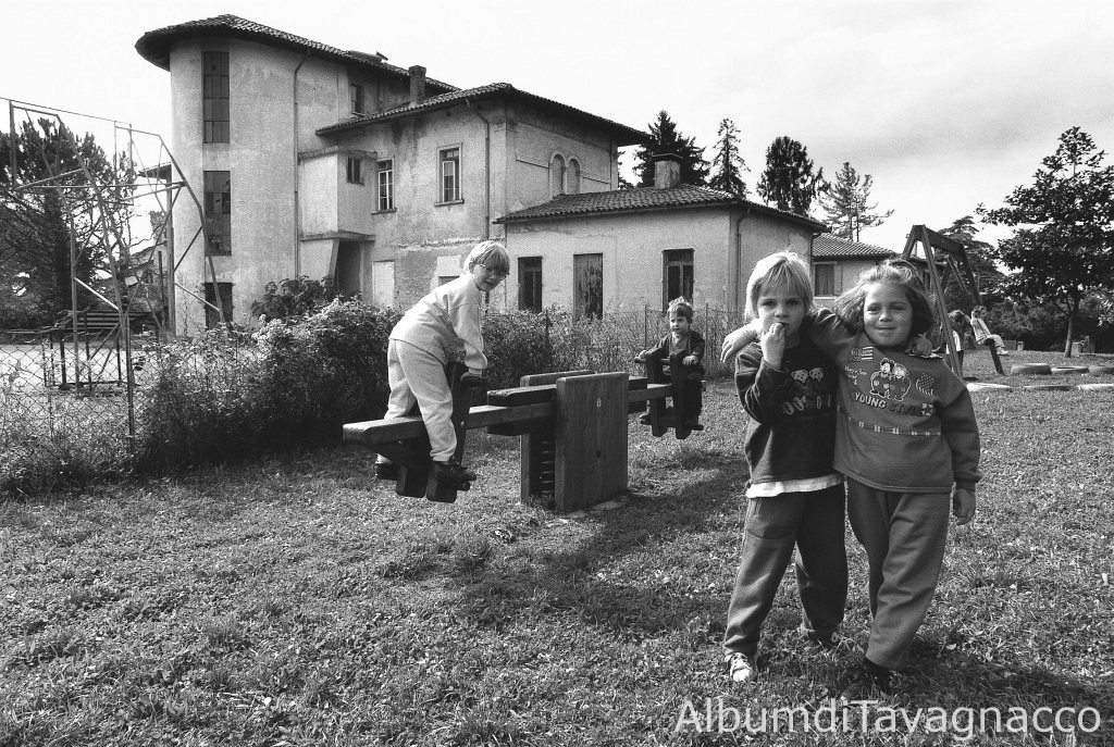 Bambini in posa e altri che giocano nel giardino dell'asilo. (Sullo sfondo il vecchio asilo).