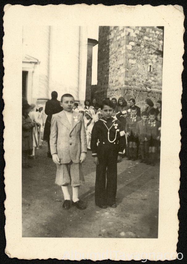 I bambini Giovanni Zamparo e Franco Barnaba, entrambi all'età apparente di 10 anni ca., in posa davanti alla chiesa di Sant'Antonio Abate, nel giorno della cresima.