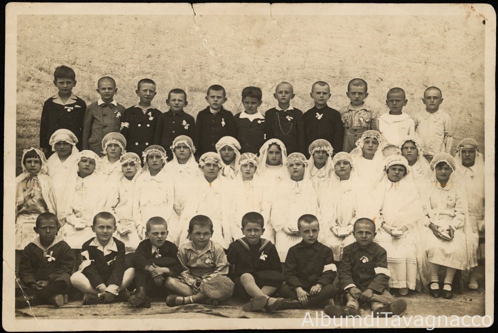 Gruppo di bambini e bambine in posa nel giorno della I^ Comunione, all'esterno della chiesa di San Clemente.