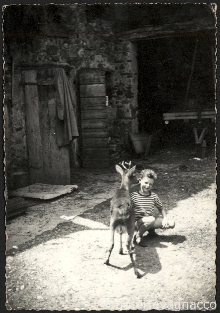 Ritratto di un bambino in posa, insieme a un capriolo, nel cortile di casa Piccini.