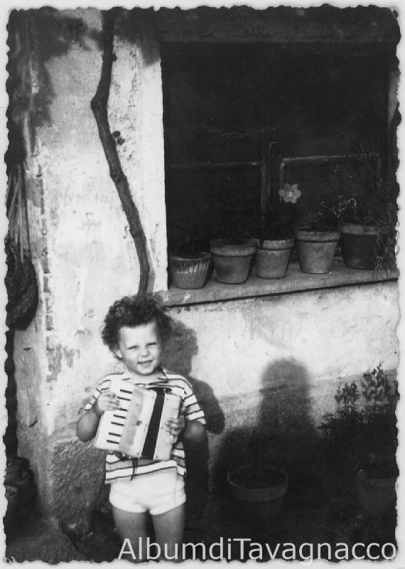 Ritratto di un bambino con la fisarmonica, in posa davanti a un balcone fiorito.