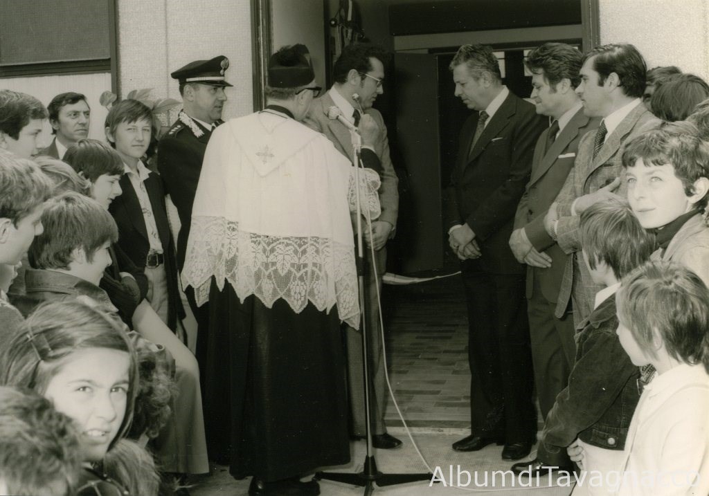 Il Parroco di Feletto, Don Nicolò Rossi, con a fianco il Sindaco Giannino Angeli e altre autorità, impartisce la benedizione in occasione dell’inaugurazione della Palestra di Feletto.