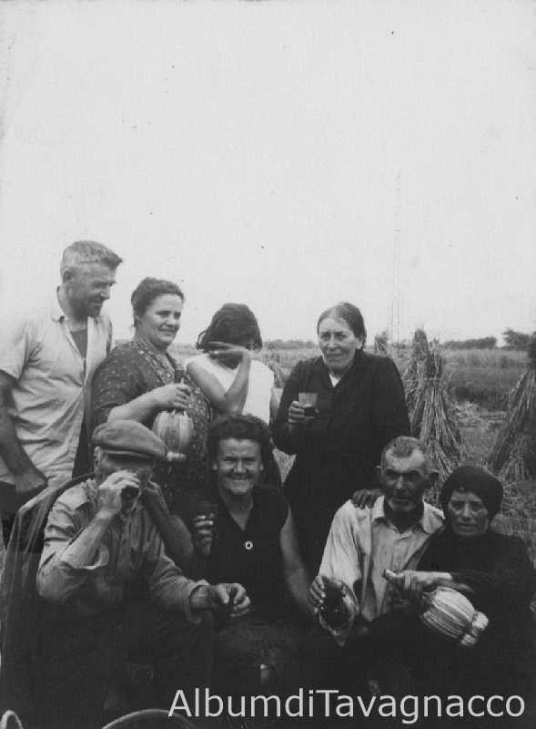 Brindisi di un gruppo di uomini e donne, in posa nei campi.