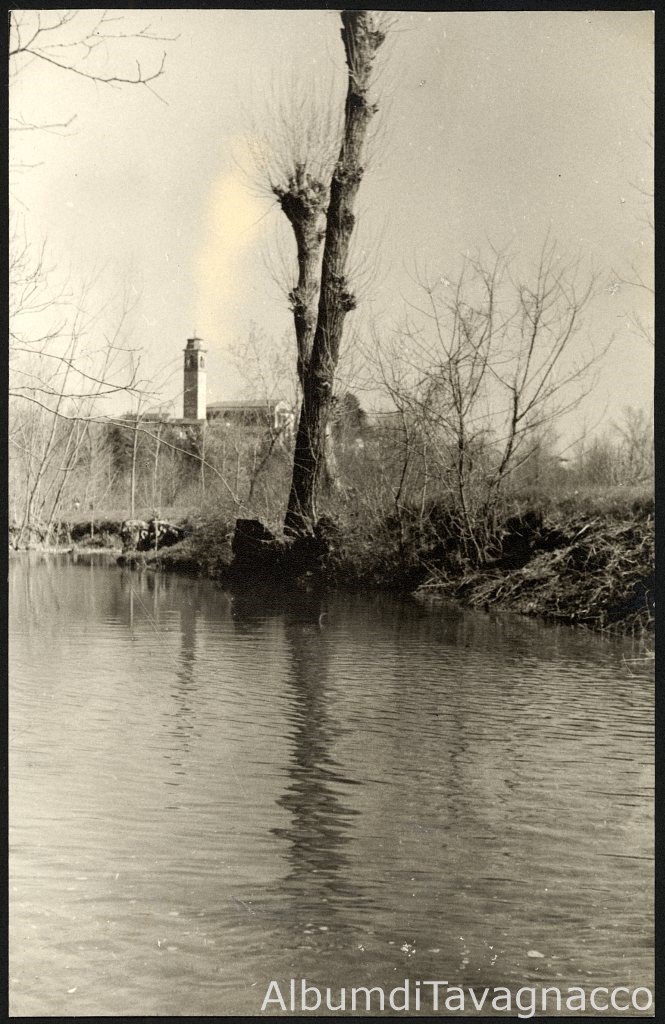 Il campanile e la chiesa di Sant'Antonio Abate, visti dal torrente Cormor.