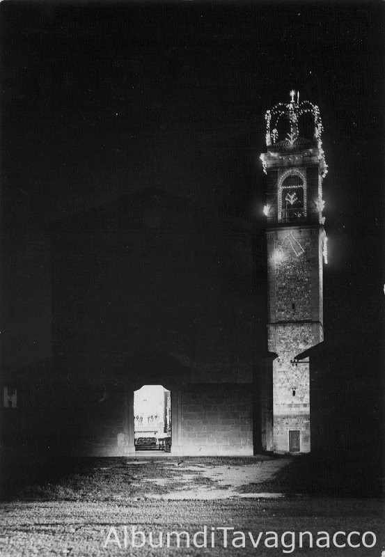 Immagine notturna con il campanile della chiesa di S.Clemente illuminato per la sagra.