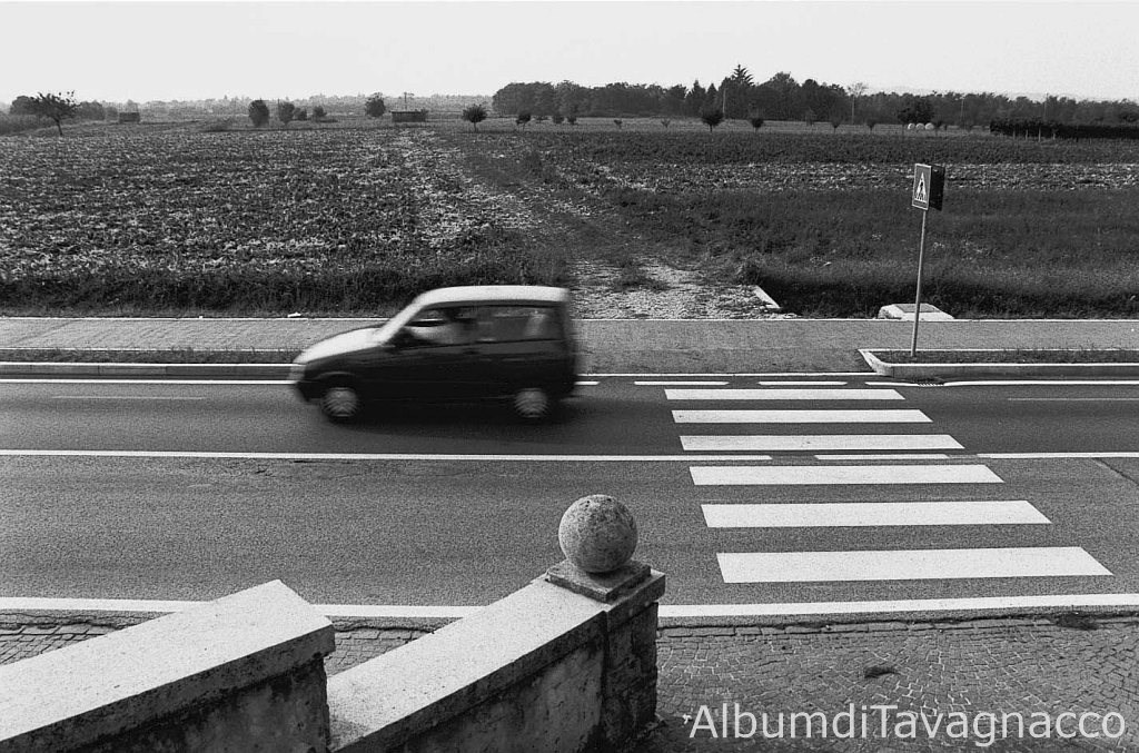 Via Colugna. - Pista ciclabile. - Marciapiede. - Strisce pedonali. - Campi. - Alberi
