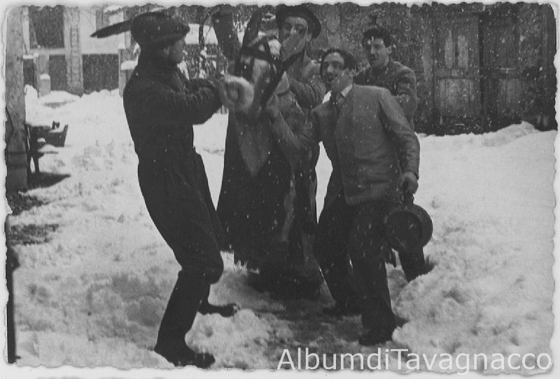 Carnevale in Vicolo Clare. Istantanea di un gruppo di giovani che partecipano a una scena scherzosa insieme a un'asino bardato, durante una nevicata.