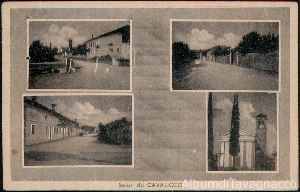 Cartolina postale con una composizione di quattro immagini fotografiche raffiguranti le strade principali di Cavalicco e la Chiesa di S.Leonardo.