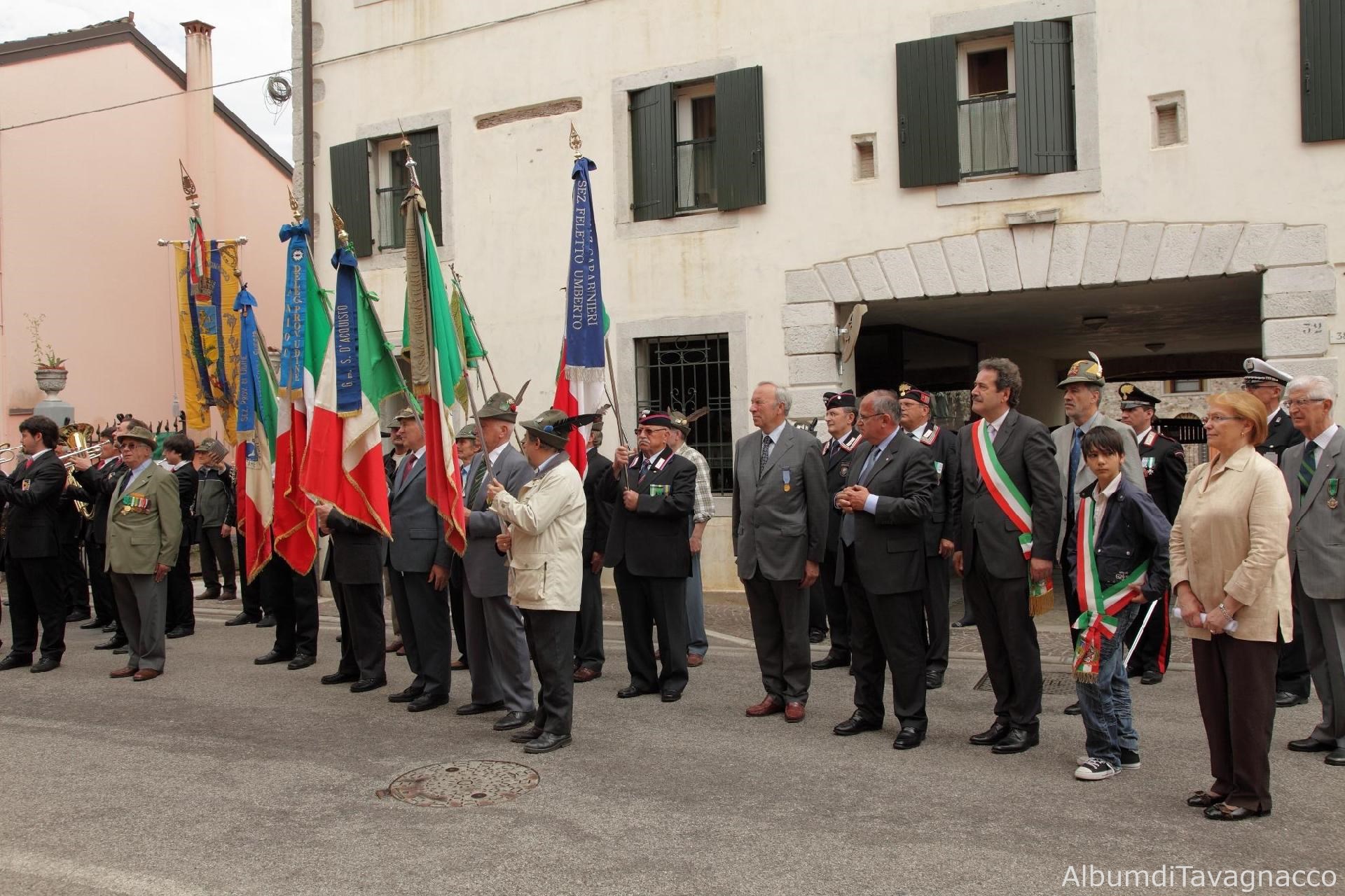 Gli Alpini con le bandiere, i Carabinieri, il Senatore Saro, il Sindaco Pezzetta, il Sindaco del Consiglio Comunale dei Ragazzi Miozzo e il Presidente delle Vittime Civili di guerra Geretto davanti alla lapide in memoria delle Vittime Civili in Via dei Martiri in occasione delle celebrazioni del 2 giugno 2010.