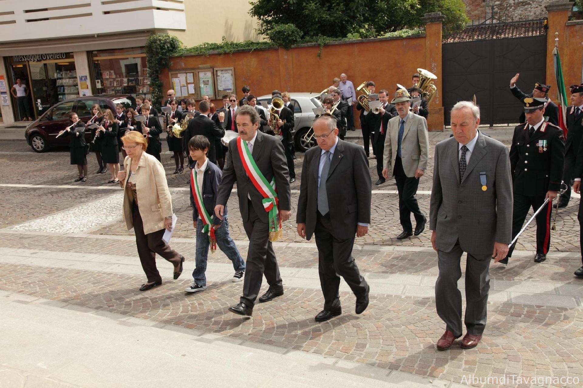 Il Presidente dell'Associazione Vittime Civili di guerra Geretto, il Sindaco del Consiglio Comunale dei Ragazzi Miozzo, il Sindaco Pezzetta e il Senatore Saro arrivano alla Chiesa Parrocchiale di Feletto al termine del corteo in occasione delle celebrazioni del 2 giugno 2010.