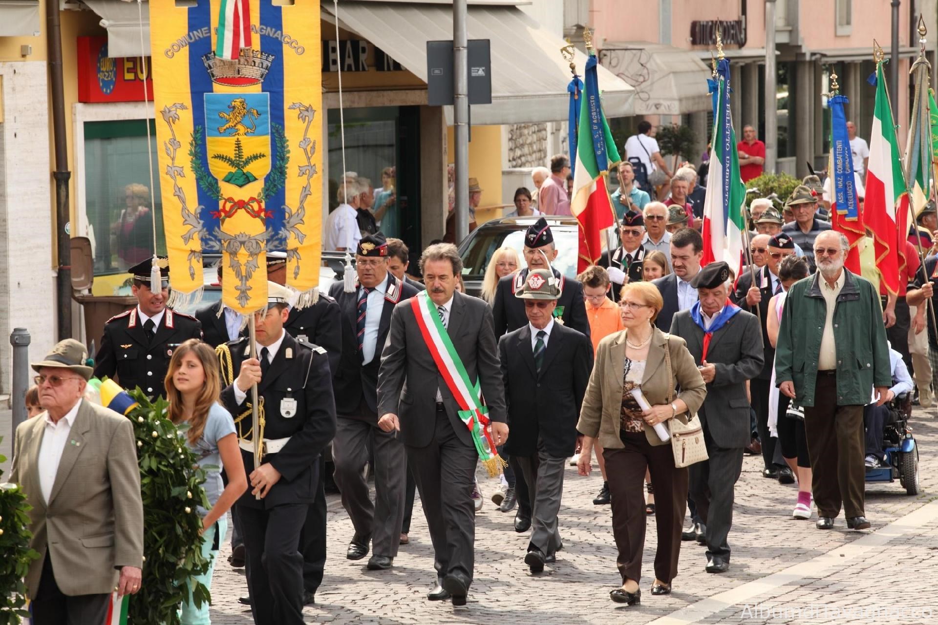 Il Sindaco Pezzetta e il Presidente delle Vittime Civili di guerra Geretto in corteo verso la Chiesa Parrocchiale di Feletto Umberto in occasione delle celebrazioni del 2 giugno 2011.
