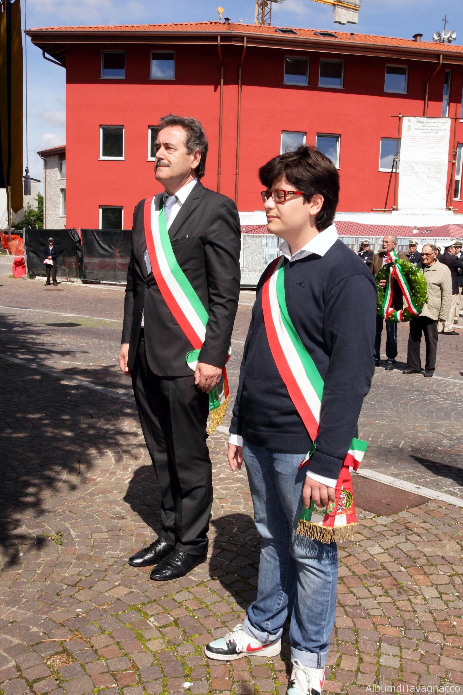 Il Sindaco Pezzetta e il Sindaco del Consiglio Comunale dei Ragazzi Oscar Bosco davanti al Monumento dei Caduti in Piazza Libertà.