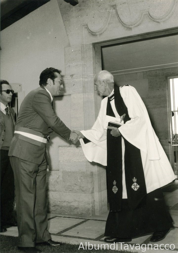 Cerimonia al Cimitero degli Inglesi. Il Sindaco Giannino Angeli, stringe la mano ad un sacerdote britannico sull’ingresso del cimitero.