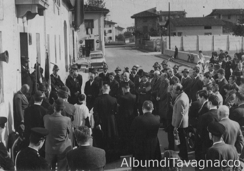 Folla davanti all'ingresso di una casa, in occasione di una cerimonia. Fra le persone presenti ci sono numerosi alpini e un gruppo di sacerdoti.