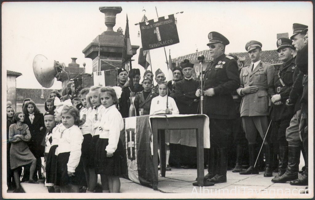 Cerimonia fascista in Piazza Libertà nel momento del discorso del federale che si trova vicino ad altri fascisti, al parroco Don Rossi, a un graduato dell'esercito e a bambine e bambini vestiti da balilla e da giovane italiana