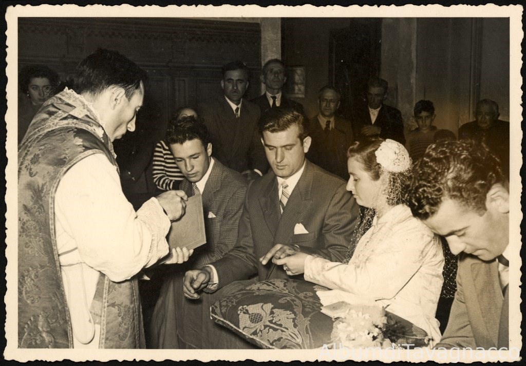 Gli sposi Ariedo Sacher e Genoveffa Feruglio sull'altare della chiesa di San Clemente durante una fase della cerimonia nuziale.